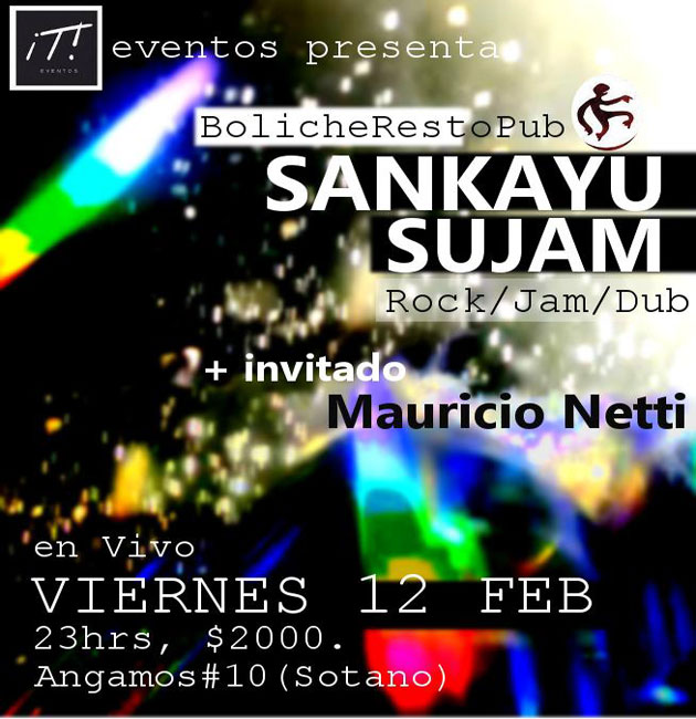 Este viernes 12 de febrero, a partir de las 23:00 horas en Boliche Pub, se viene una noche de rock jam progresivo de la mano de Sujam y Sankayu, además como invitado especial y abriendo el show, el cantautor Mauricio Netti presentando su último álbum “Soy”.